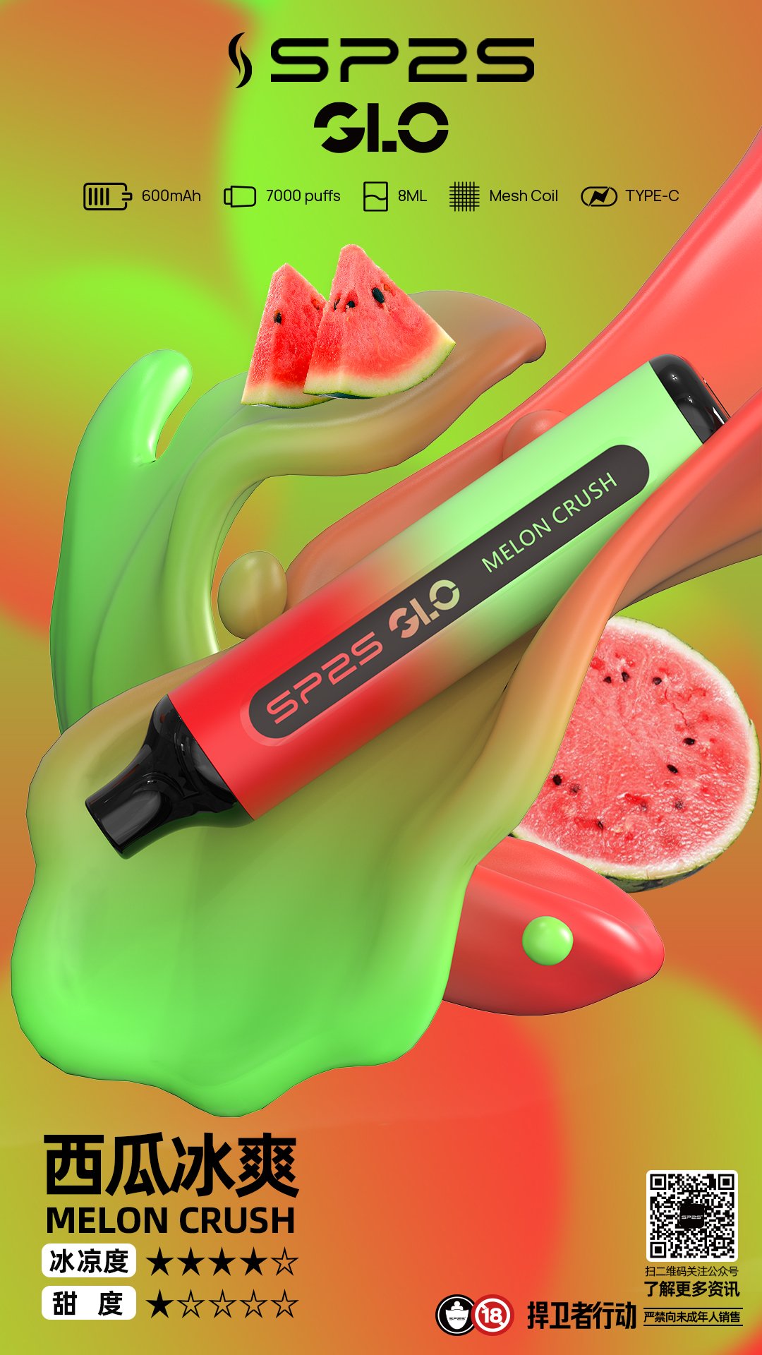 SP2S GLO 7000口 一次性電子煙,配備8mL大容量煙油與600mAh電池,提供15種精緻口味,涵蓋水果、清涼、茶飲等,滿足多元需求。